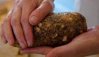 Décorez avec les amandes et la noix mises de côté. Enfin, protégez avec du film transparent ou du cellophane pour que cela ne se durcisse pas.