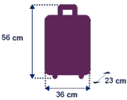 Votre bagage cabine peut mesurer jusqu'à 56 cm x 36 cm x 23 cm cm et 7 kg au maximum, poches, roues et poignées comprises. Ce type de bagage se range dans le compartiment prévu à cet effet, au-dessus de votre siège.